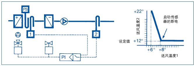 設(shè)定值可調(diào)的啟動(dòng)控制需要一個(gè)在霜凍保護(hù)溫控器毛細(xì)管附近直接安裝的平均傳感器。如果溫度低于設(shè)定值,那么用于控制送風(fēng)溫度的設(shè)定溫度將會(huì)得到調(diào)整。