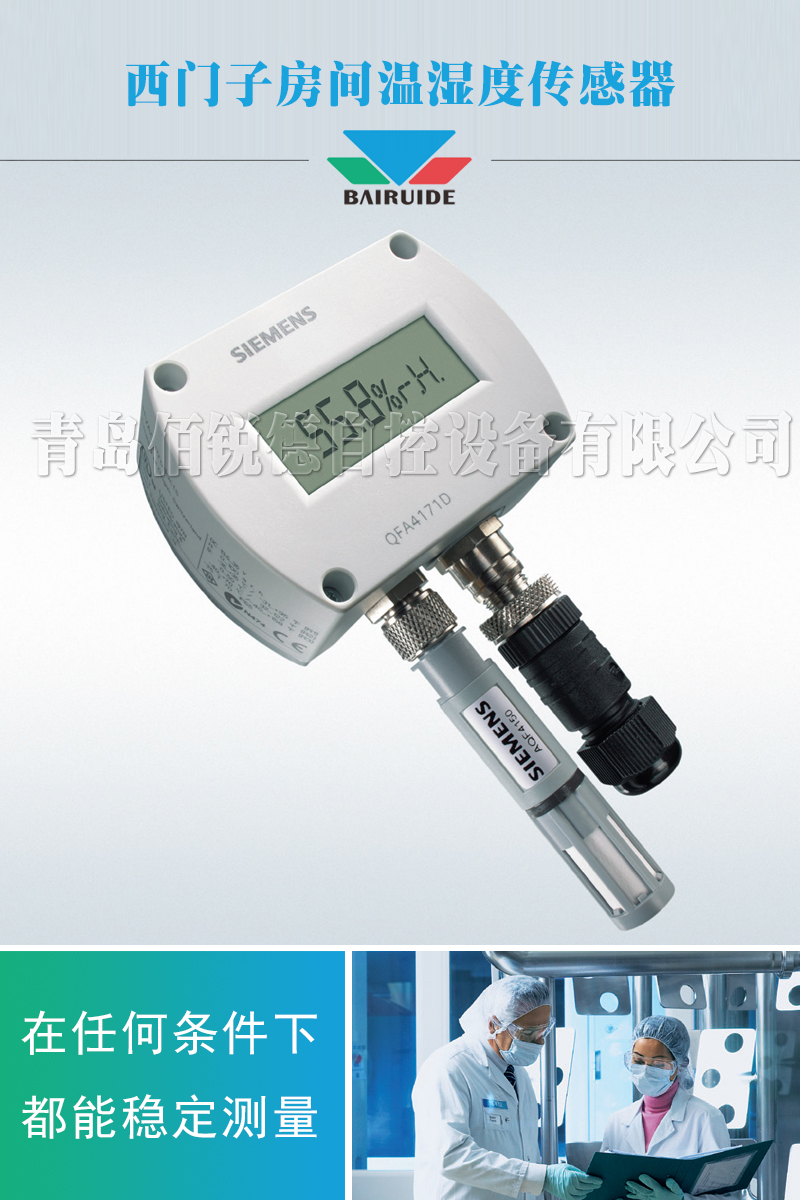 西門子溫濕度傳感器 QFM4..高精度帶標定證書風管安裝測量相對濕度和溫度濕度測量范圍:0...100%r.h.濕度測量精度:0...100%相對濕度,23℃時,精度為±23% .溫度測量范圍:0..50℃/-35...35℃/-40...70℃時間常數(shù):濕度20s;溫度20s浸入長度:90...206mm接線:4線防護等級:IP65型號概覽參考型號溫度元件…